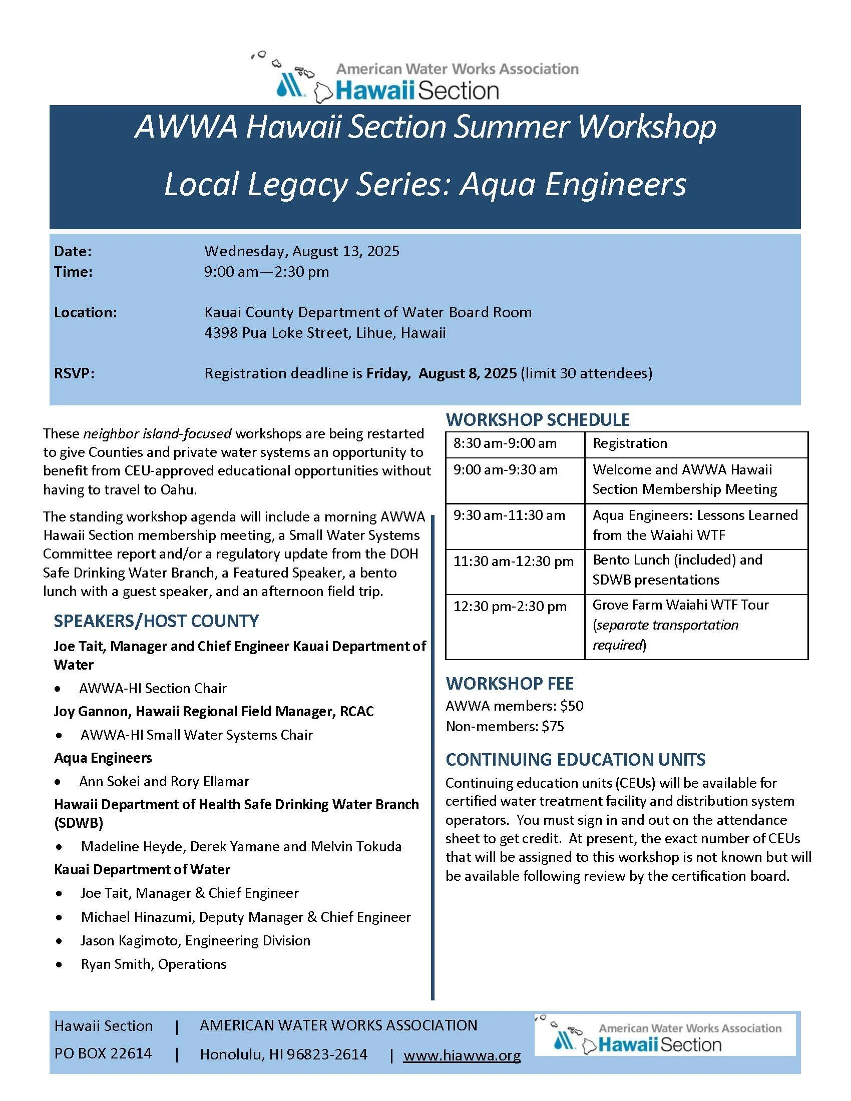 AWWA Hawaii Section Summer 2025 Workshop Flyer and Registration (link to PDF for email/paper registration and offline payment)